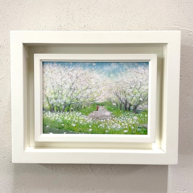 原画:桜道 【作品解説】 春満開の桜の花道。 希望溢れる春を願い制作。 玄関やリビングに飾って、日々の癒しや元気に繋がれば幸いです。 作者 芳賀健太(yoshiga kenta) 大きさ:絵画はSM号(227×150mm)・額縁外寸:たて25.8cm×よこ32.7㎝×奥行4.5㎝ 素材:アクリル絵の具・キャンバス 額カラー:オフホワイト 材質:木製(南洋材)額縁 表面保護:アクリルガラス仕様 裏:壁に飾れるように紐を通しております。(ピンなどでも飾れる重さです) ※ ほぼ実物に近いように撮影をしていますが、パソコンでの閲覧という特性上、商品の画像が実際の色目と多少異なる場合が有りますがご了承ください。 色の劣化を防ぐために、ご購入後は、直射日光ができるだけ当たらない場所に飾られてください。