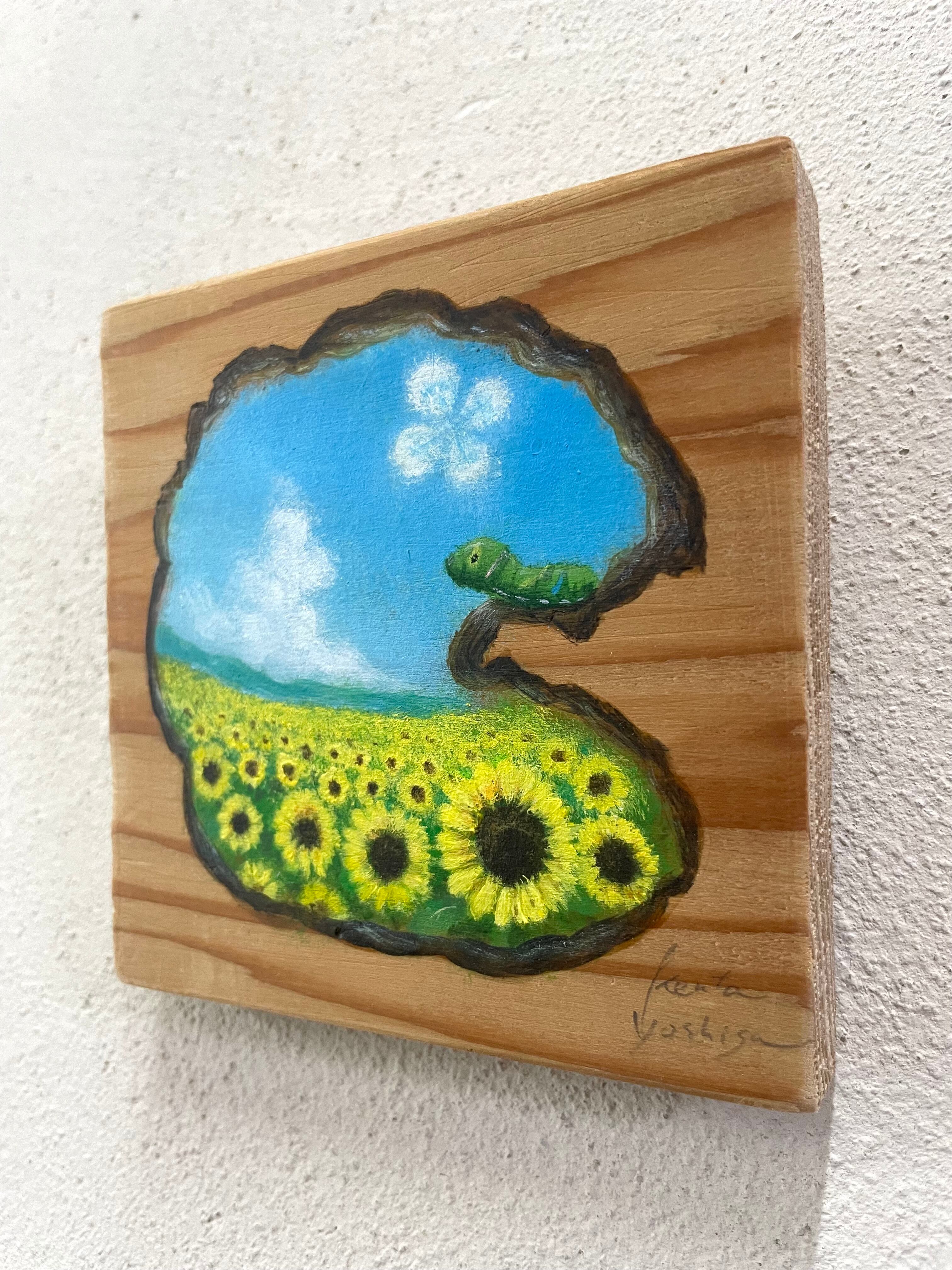 このシリーズは、杉の板に直接描いたもので、まるで本物のトリックアートのような手法で描いています。